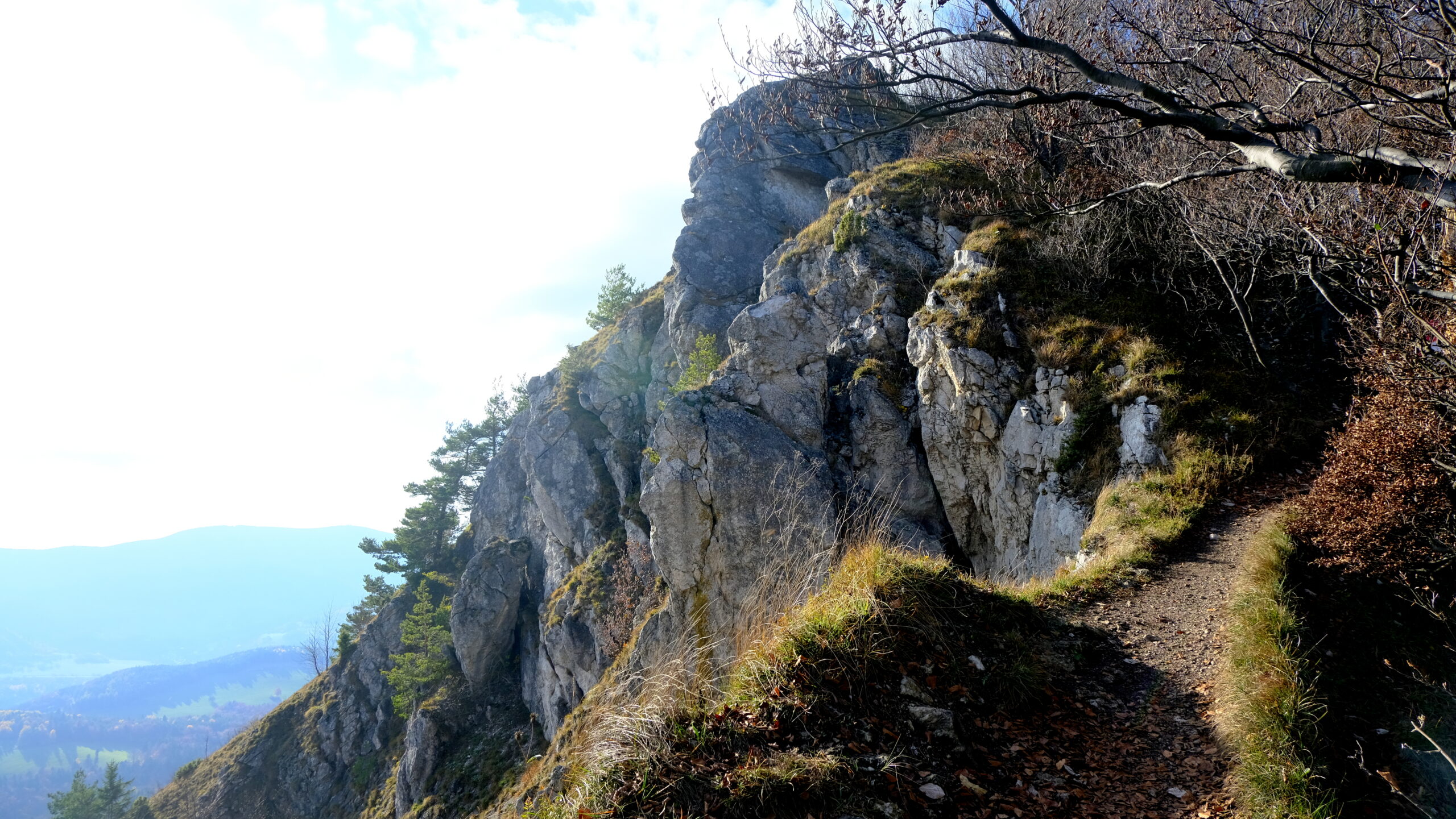 Postupne sa chodník začal dvíhať strmšie, a keď sa les otvoril, objavili sa prvé výhľady na okolité kopce a doliny. Záverečný úsek na samotný Vápeč už bol prudší, no skalnatý terén a výhľad, ktorý sa nám zhora naskytol, stál za každú kvapku potu. Videli sme Strážov, Rokoš aj vzdialené vrcholy Malej Fatry.