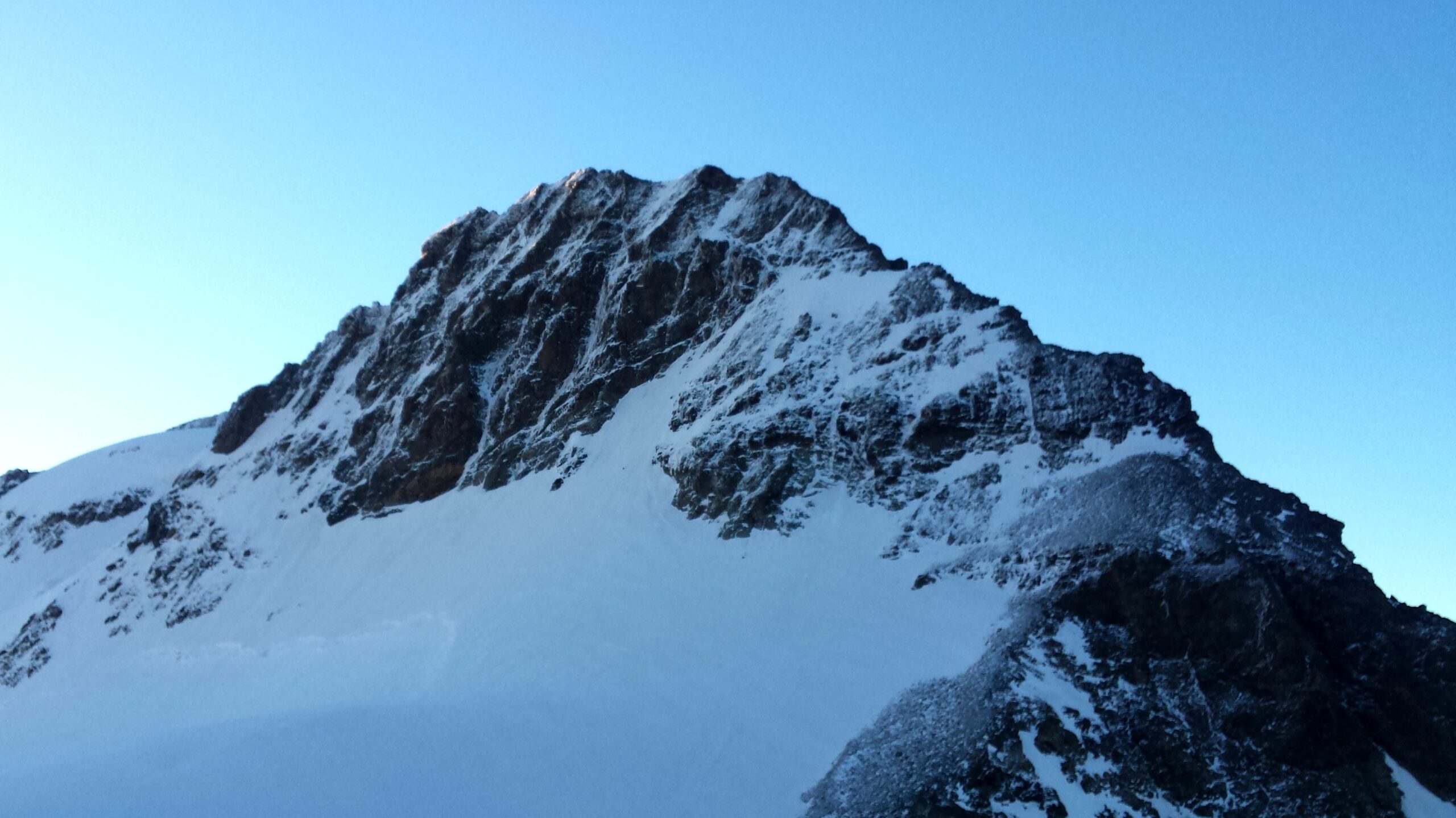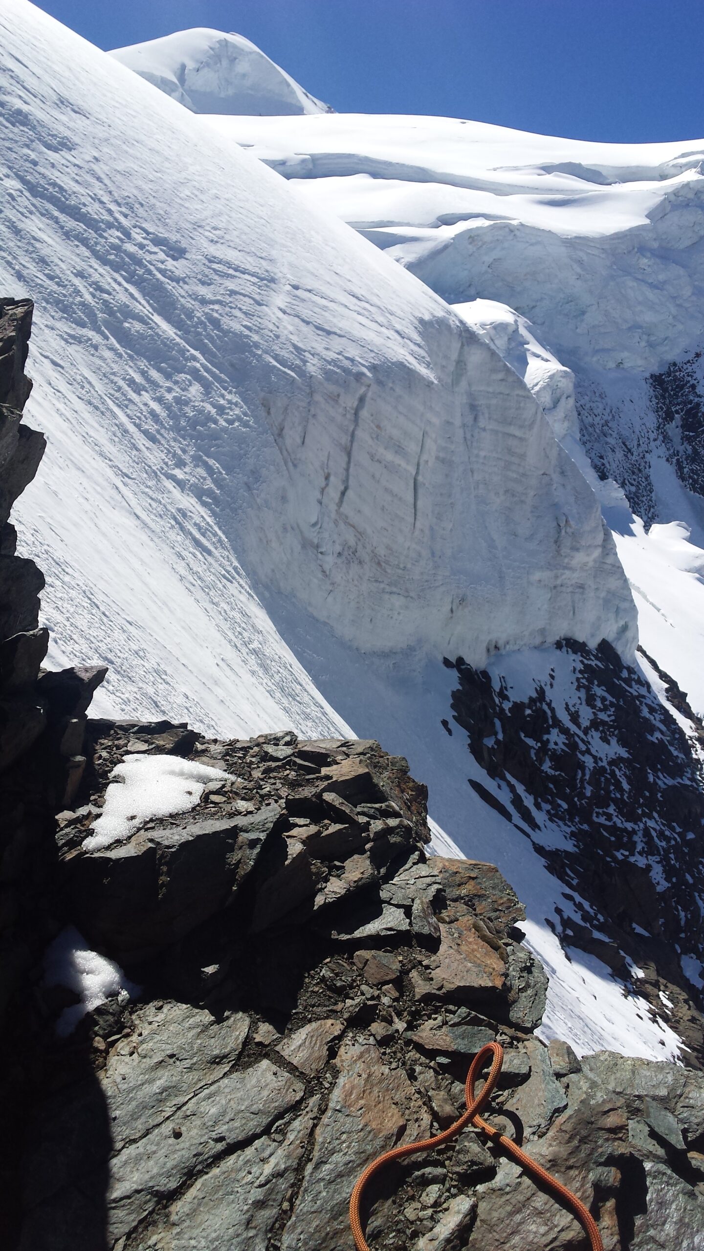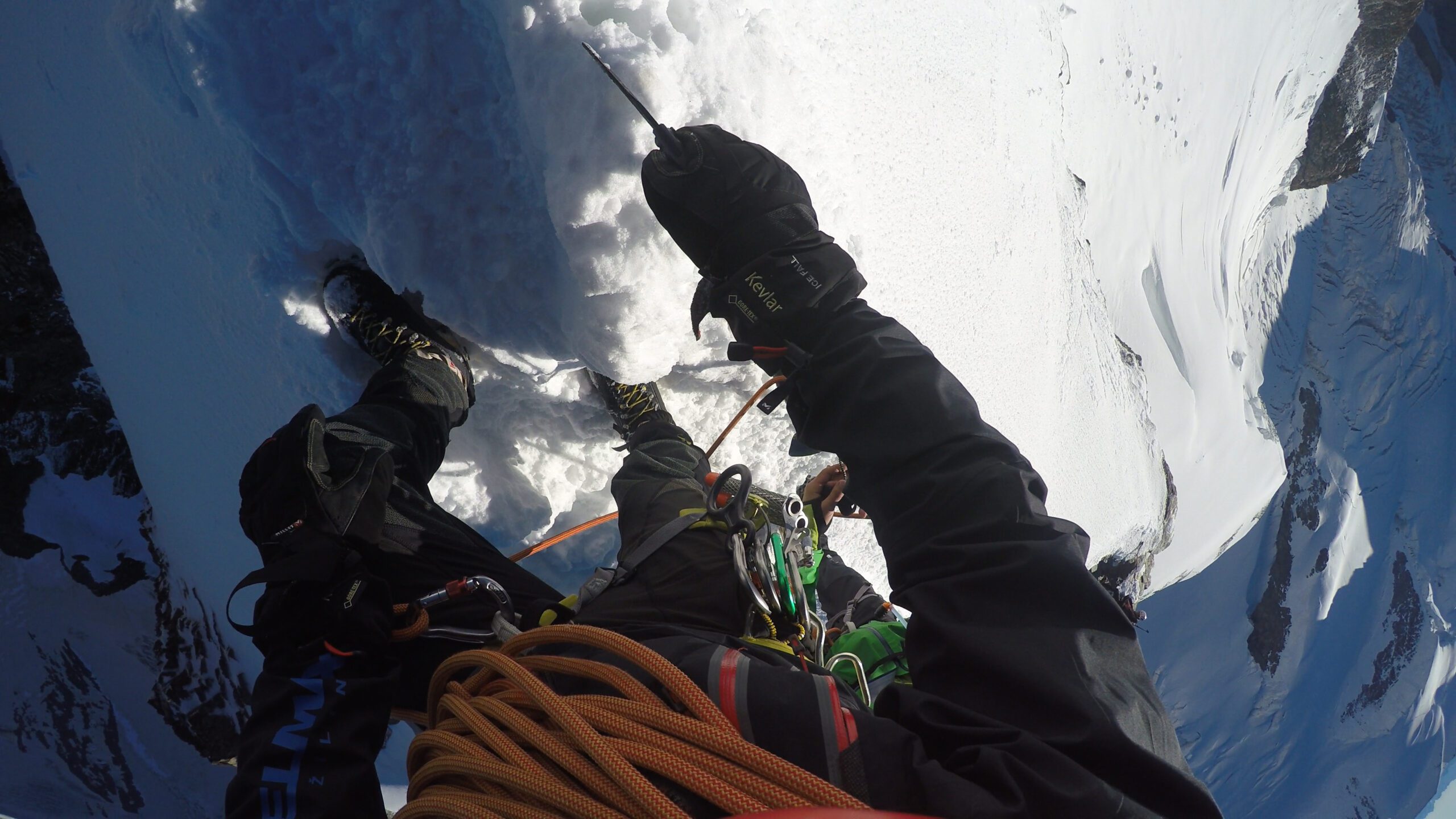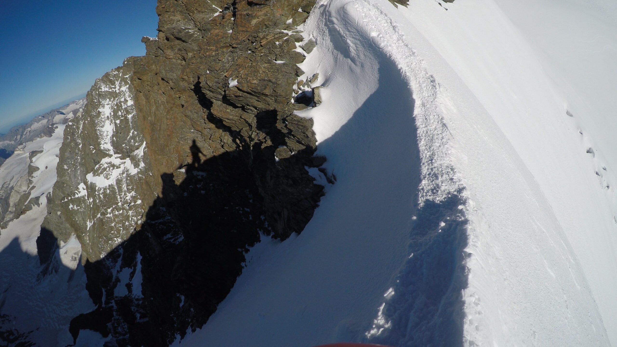 Ráno sme vyrazili v dokonalej forme, stúpanie cez krásny ľadovec bolo rytmické, prehľadné a podfarbené pocitom, že sme súčasťou veľkolepej scenérie. Každý krok po tvrdom snehu znel ako jemná hudba, okolité štíty sa odrážali v drobných ľadových štruktúrach a my sme mali pocit, akoby celé Alpy dýchali spolu s nami. Na lane nám to šlo presne a intuitívne – jeden pohyb nadväzoval na druhý, akoby sme spolu liezli už roky. Mixové úseky nám sadli, neboli ani priveľmi tvrdé, ani príliš jednoduché – presne ten typ terénu, pri ktorom človek cíti, že je skutočne nažive a že každý krok aj úchop má svoj hlboký zmysel. Keď sme sa približovali k hrebeňu, otvoril sa pred nami obraz, ktorý sa nezabúda – ostrý snehový chrbát spájajúci svetlo a tieň, zalievaný chladným vetrom, ktorý nás lákal dopredu s prísľubom vrcholu na dosah ruky.