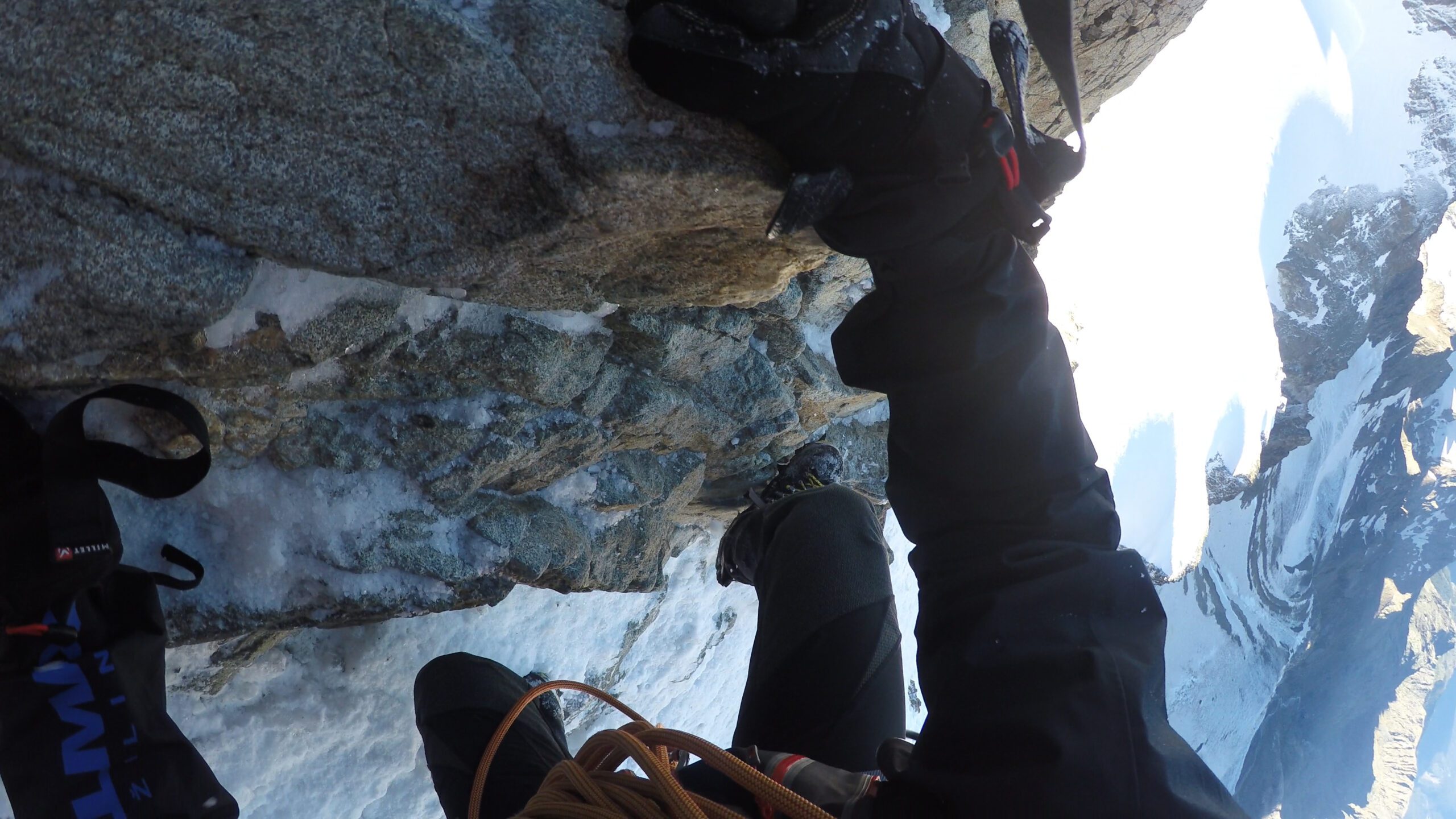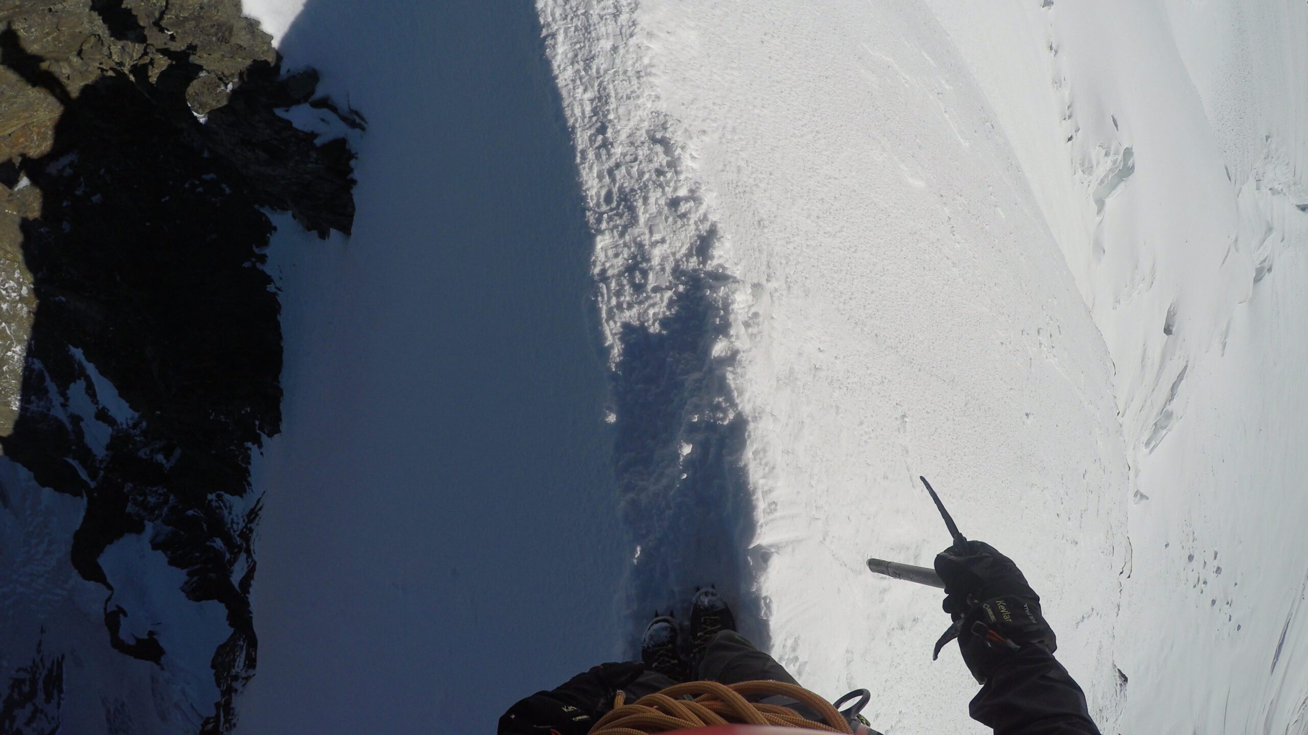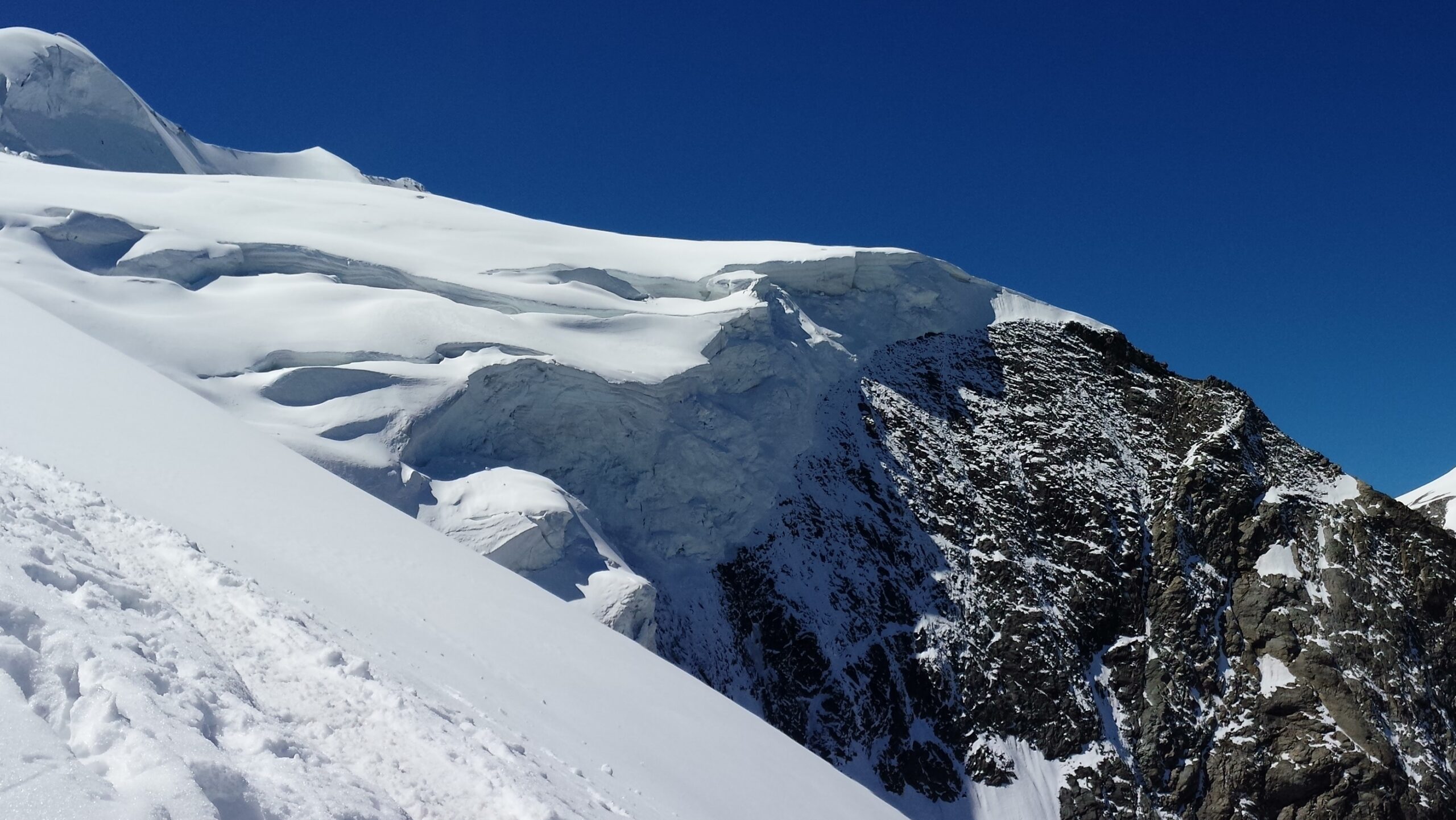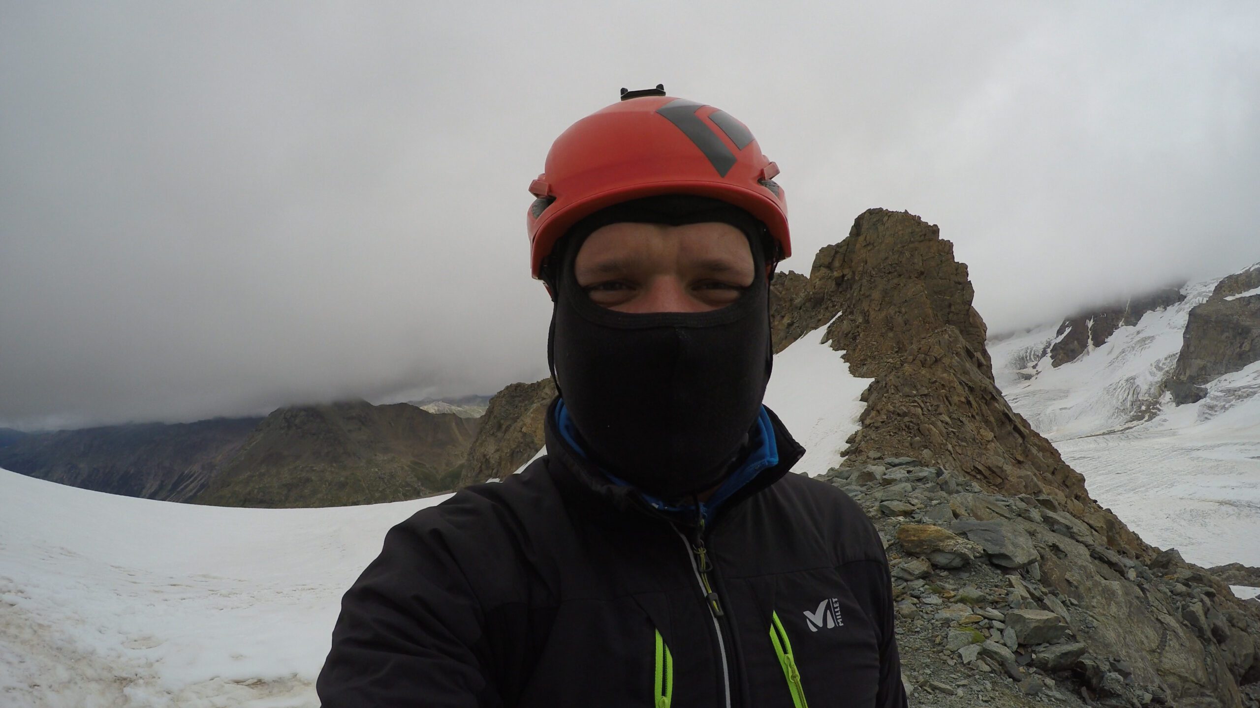Ráno sme vyrazili v dokonalej forme, stúpanie cez krásny ľadovec bolo rytmické, prehľadné a podfarbené pocitom, že sme súčasťou veľkolepej scenérie. Každý krok po tvrdom snehu znel ako jemná hudba, okolité štíty sa odrážali v drobných ľadových štruktúrach a my sme mali pocit, akoby celé Alpy dýchali spolu s nami. Na lane nám to šlo presne a intuitívne – jeden pohyb nadväzoval na druhý, akoby sme spolu liezli už roky. Mixové úseky nám sadli, neboli ani priveľmi tvrdé, ani príliš jednoduché – presne ten typ terénu, pri ktorom človek cíti, že je skutočne nažive a že každý krok aj úchop má svoj hlboký zmysel. Keď sme sa približovali k hrebeňu, otvoril sa pred nami obraz, ktorý sa nezabúda – ostrý snehový chrbát spájajúci svetlo a tieň, zalievaný chladným vetrom, ktorý nás lákal dopredu s prísľubom vrcholu na dosah ruky.
