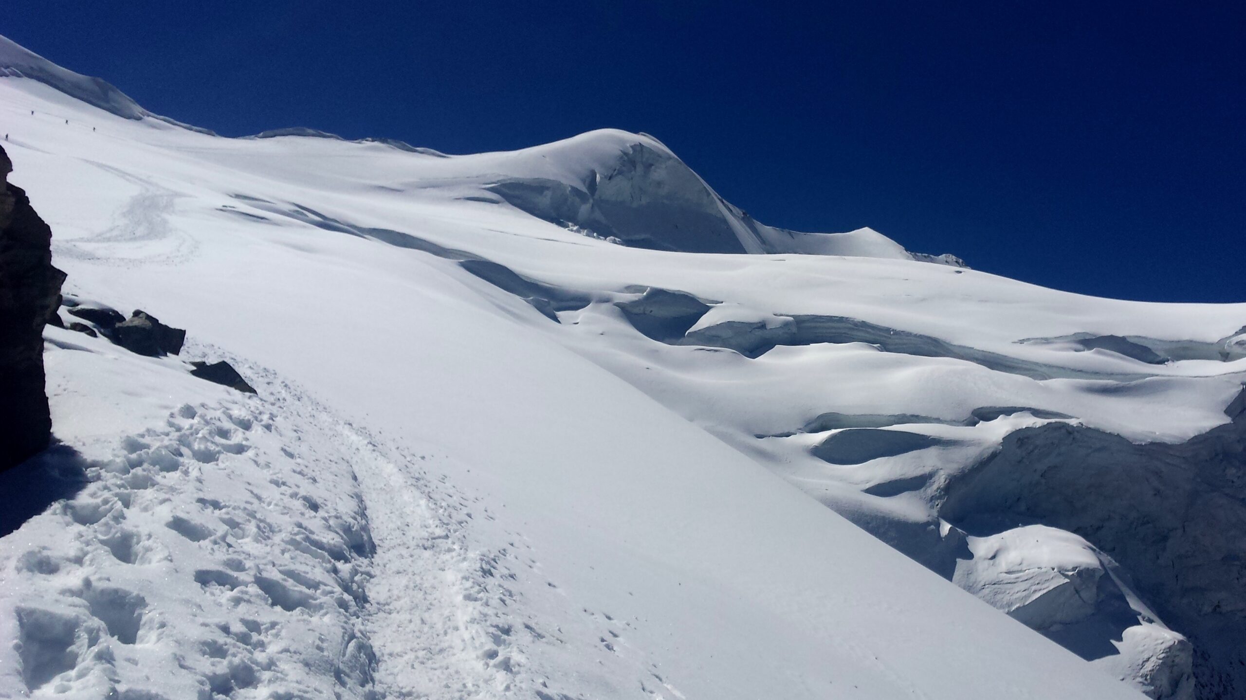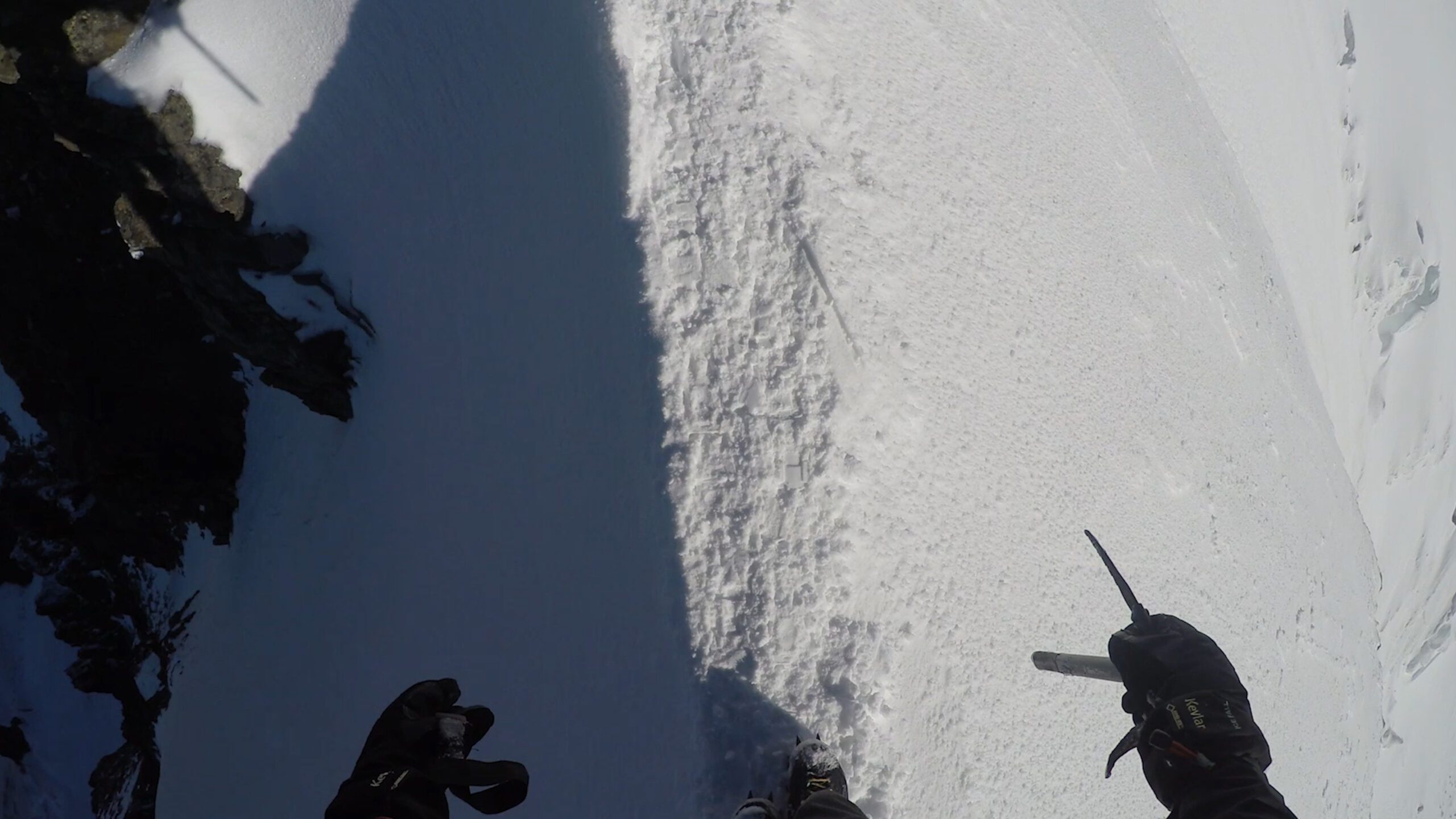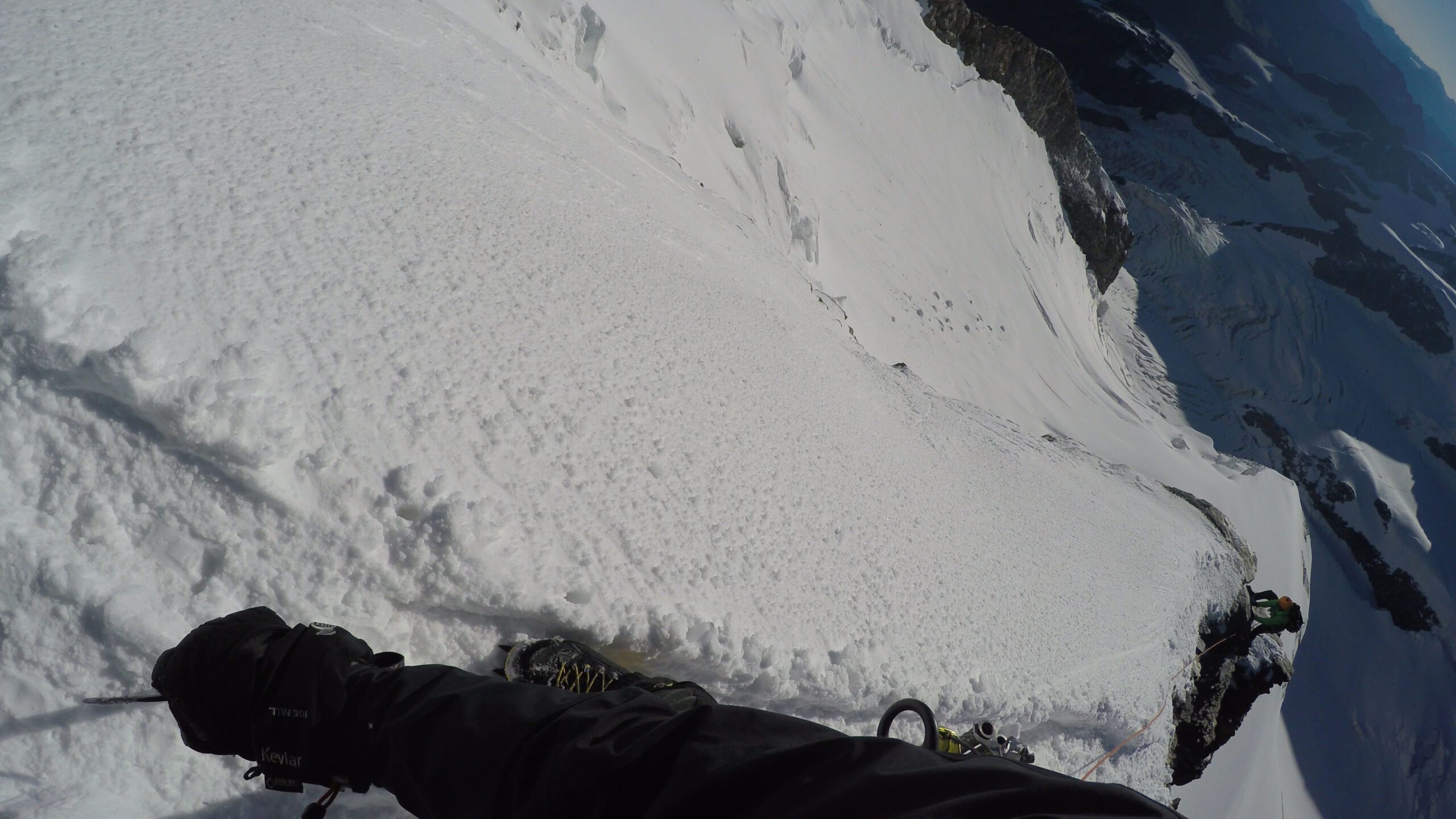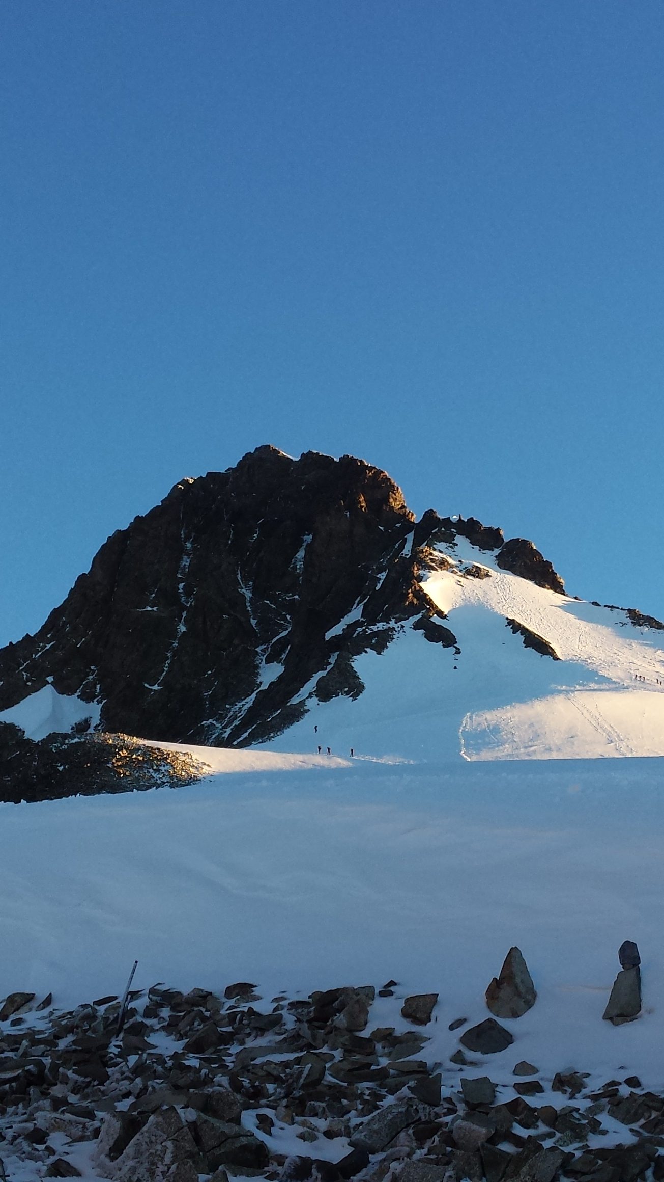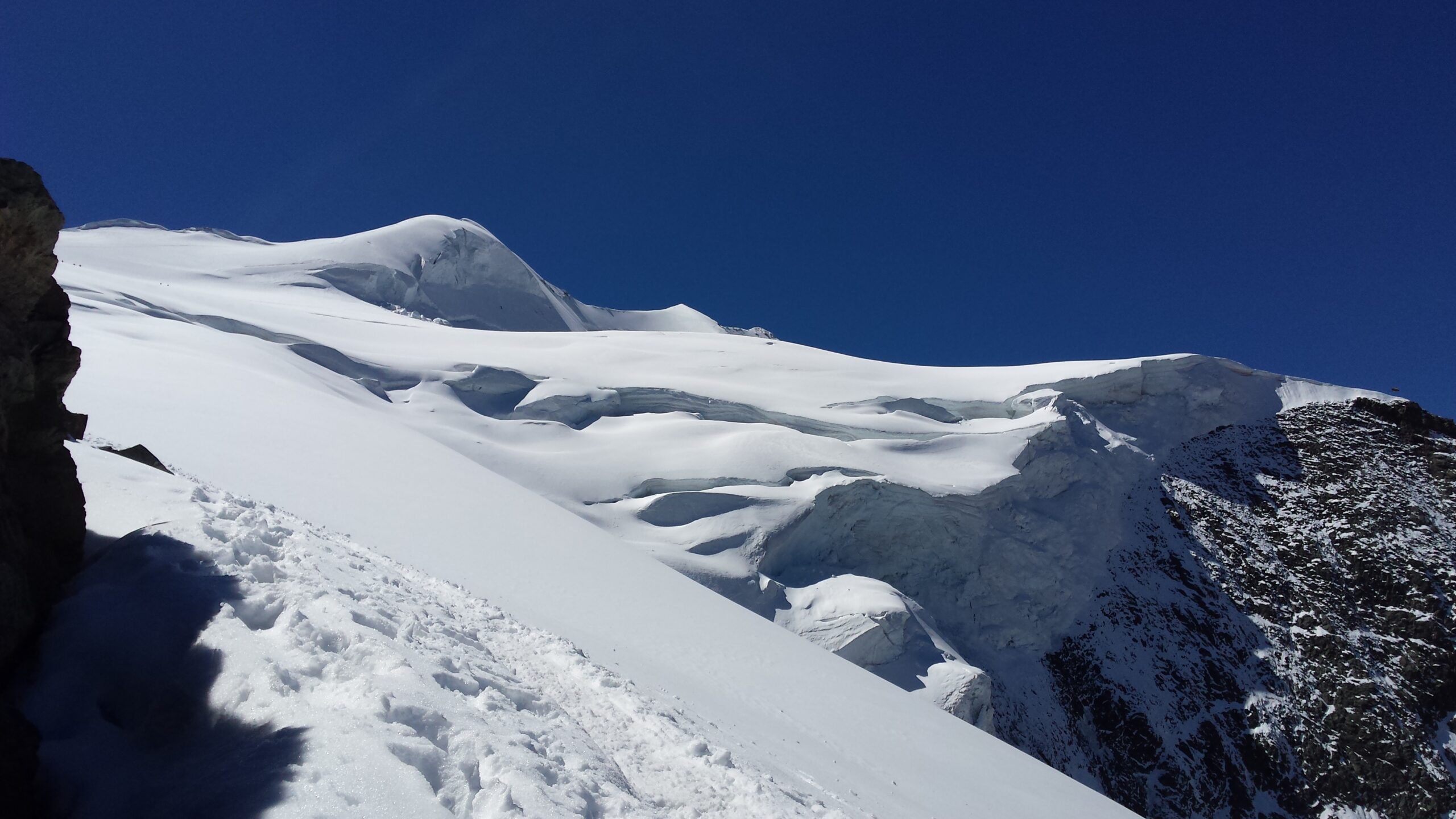Ráno sme vyrazili v dokonalej forme, stúpanie cez krásny ľadovec bolo rytmické, prehľadné a podfarbené pocitom, že sme súčasťou veľkolepej scenérie. Každý krok po tvrdom snehu znel ako jemná hudba, okolité štíty sa odrážali v drobných ľadových štruktúrach a my sme mali pocit, akoby celé Alpy dýchali spolu s nami. Na lane nám to šlo presne a intuitívne – jeden pohyb nadväzoval na druhý, akoby sme spolu liezli už roky. Mixové úseky nám sadli, neboli ani priveľmi tvrdé, ani príliš jednoduché – presne ten typ terénu, pri ktorom človek cíti, že je skutočne nažive a že každý krok aj úchop má svoj hlboký zmysel. Keď sme sa približovali k hrebeňu, otvoril sa pred nami obraz, ktorý sa nezabúda – ostrý snehový chrbát spájajúci svetlo a tieň, zalievaný chladným vetrom, ktorý nás lákal dopredu s prísľubom vrcholu na dosah ruky.