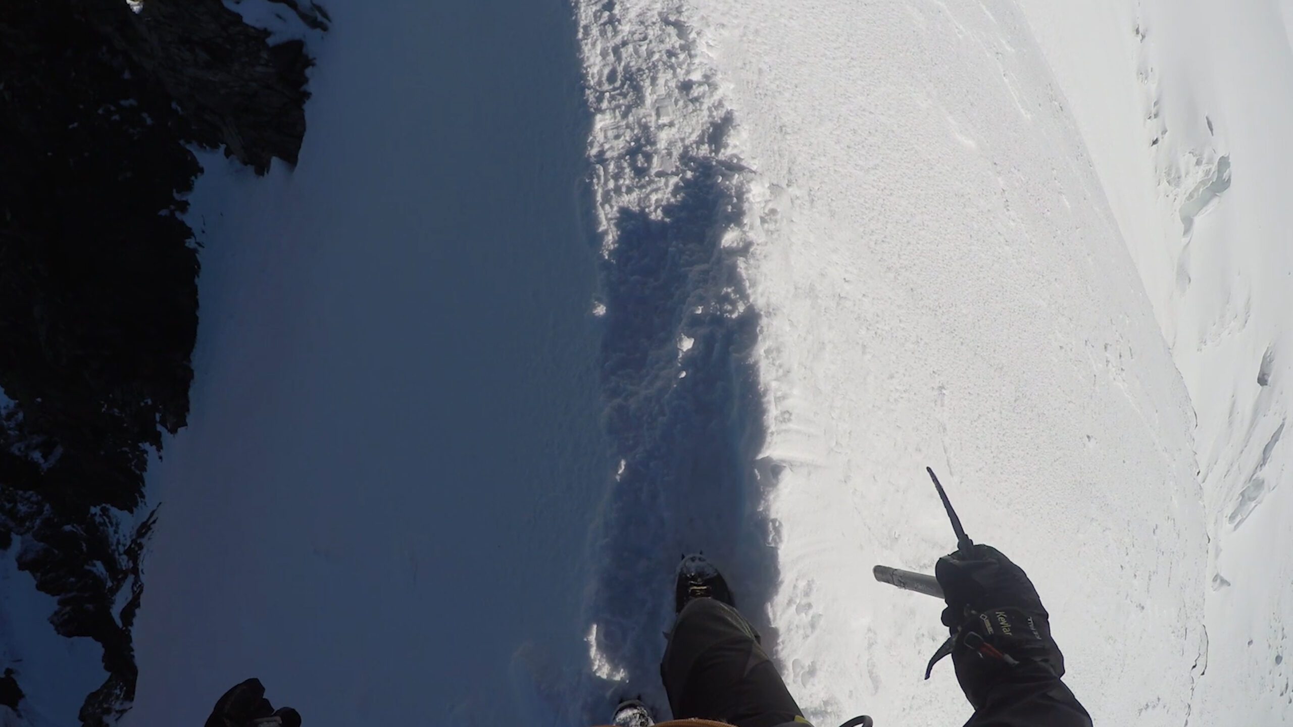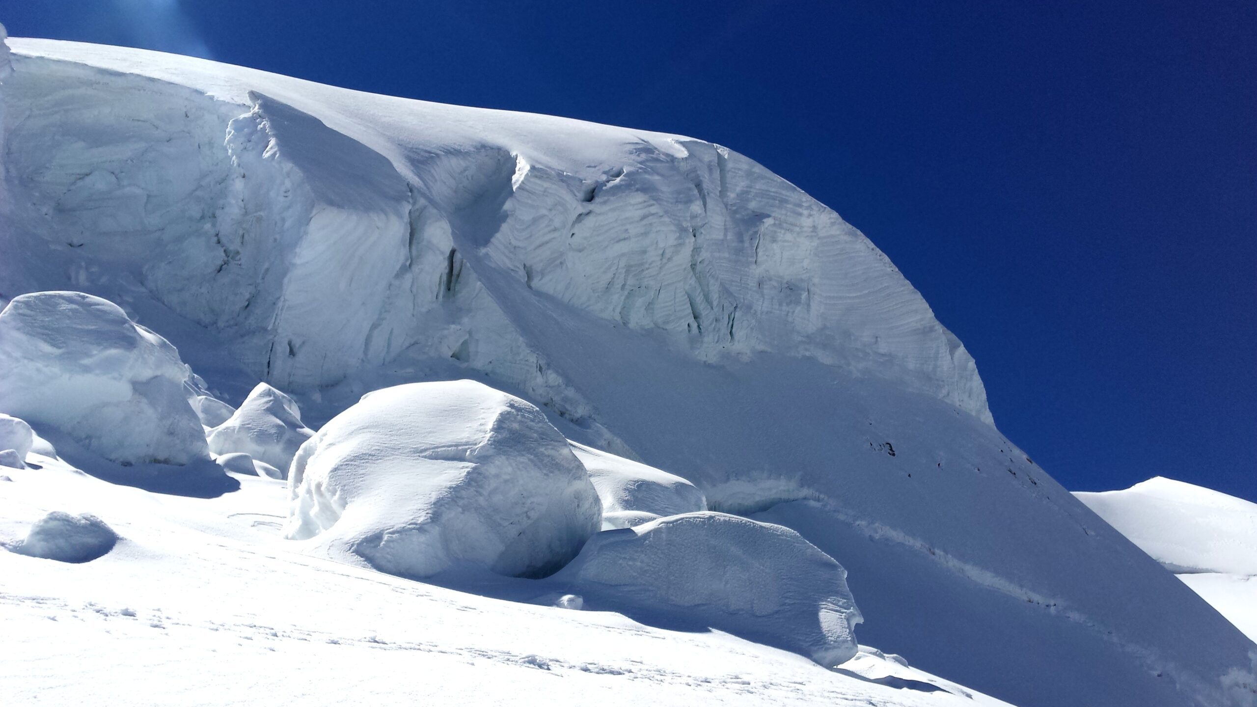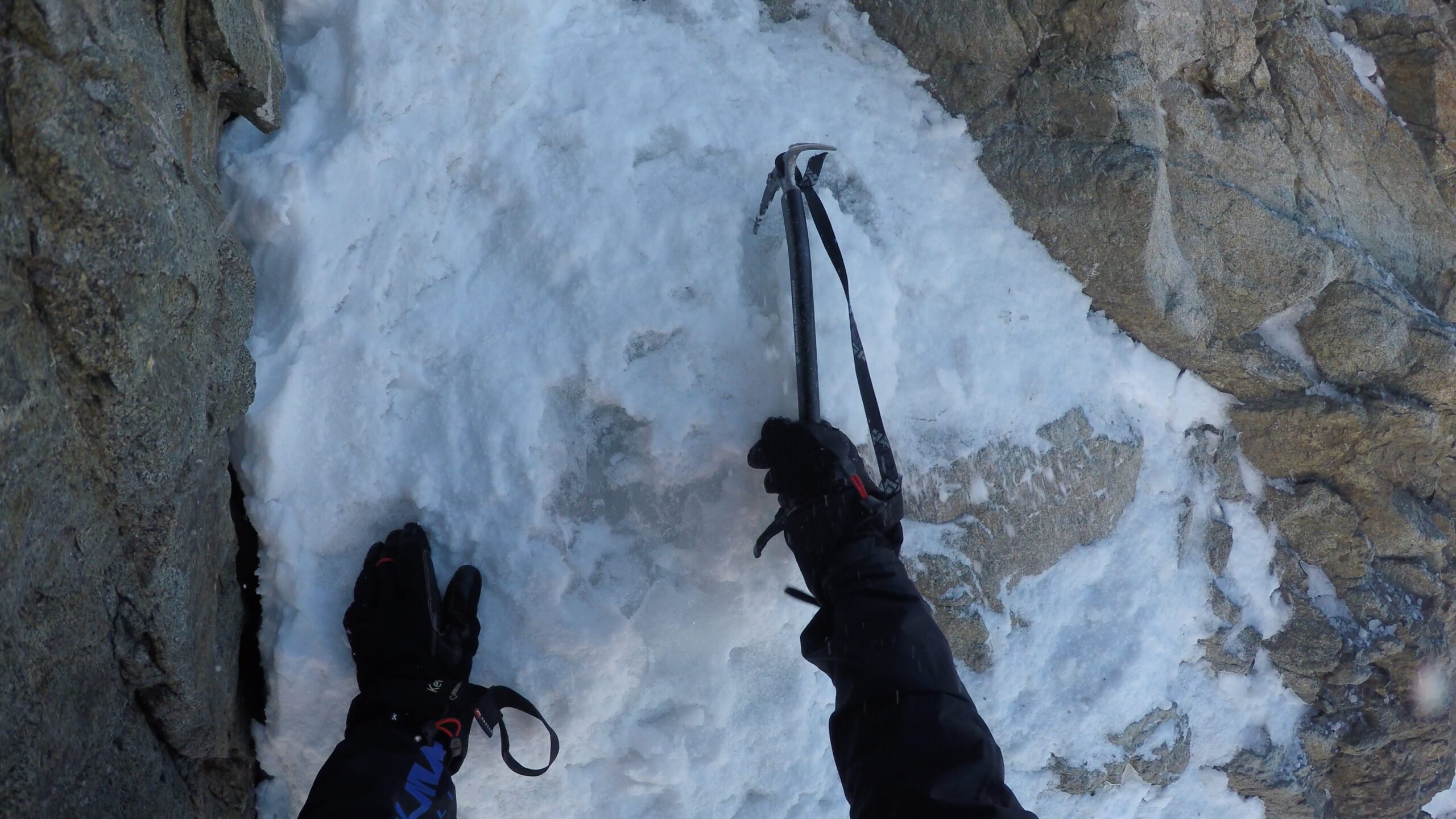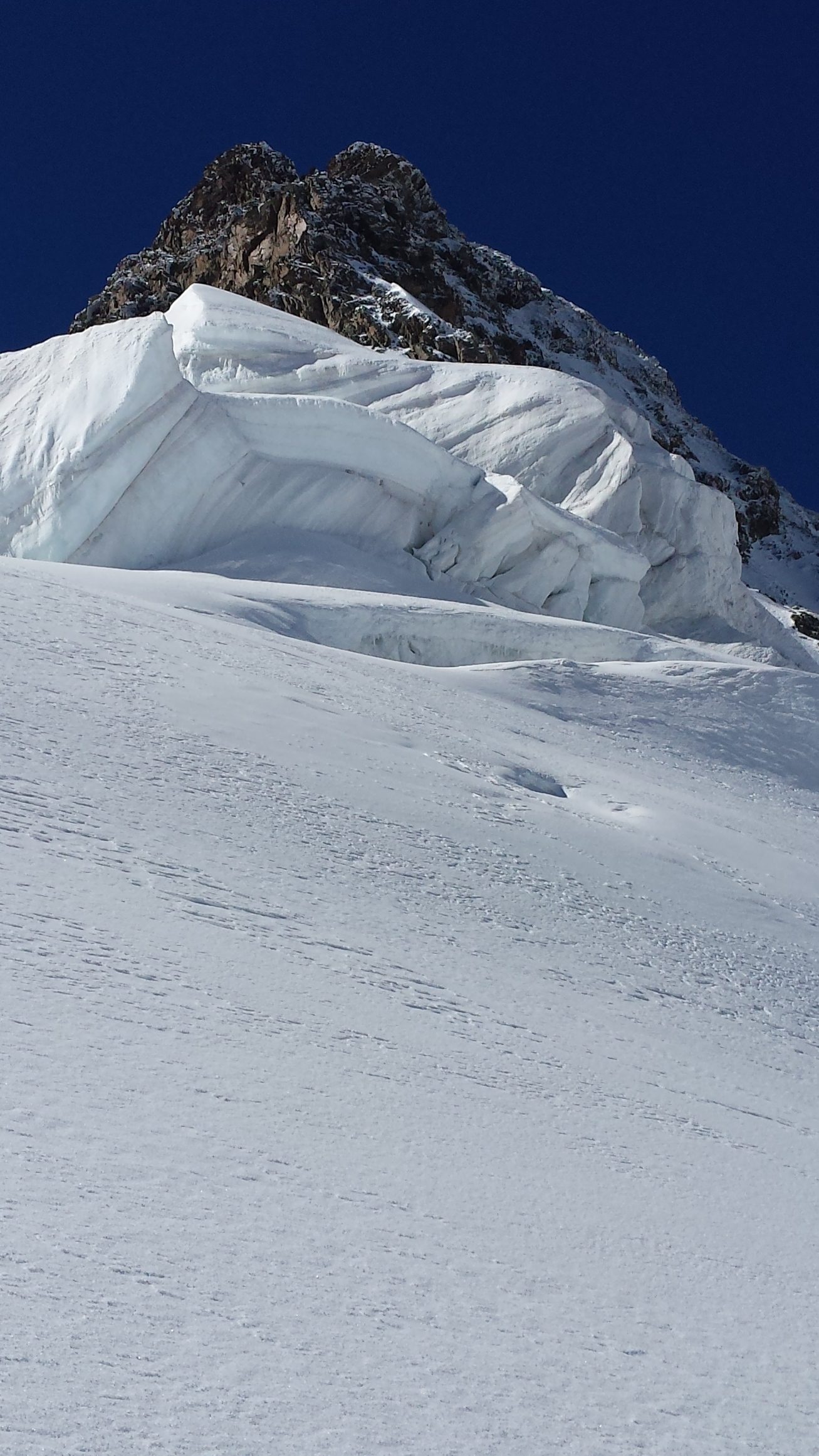 Ráno sme vyrazili v dokonalej forme, stúpanie cez krásny ľadovec bolo rytmické, prehľadné a podfarbené pocitom, že sme súčasťou veľkolepej scenérie. Každý krok po tvrdom snehu znel ako jemná hudba, okolité štíty sa odrážali v drobných ľadových štruktúrach a my sme mali pocit, akoby celé Alpy dýchali spolu s nami. Na lane nám to šlo presne a intuitívne – jeden pohyb nadväzoval na druhý, akoby sme spolu liezli už roky. Mixové úseky nám sadli, neboli ani priveľmi tvrdé, ani príliš jednoduché – presne ten typ terénu, pri ktorom človek cíti, že je skutočne nažive a že každý krok aj úchop má svoj hlboký zmysel. Keď sme sa približovali k hrebeňu, otvoril sa pred nami obraz, ktorý sa nezabúda – ostrý snehový chrbát spájajúci svetlo a tieň, zalievaný chladným vetrom, ktorý nás lákal dopredu s prísľubom vrcholu na dosah ruky.